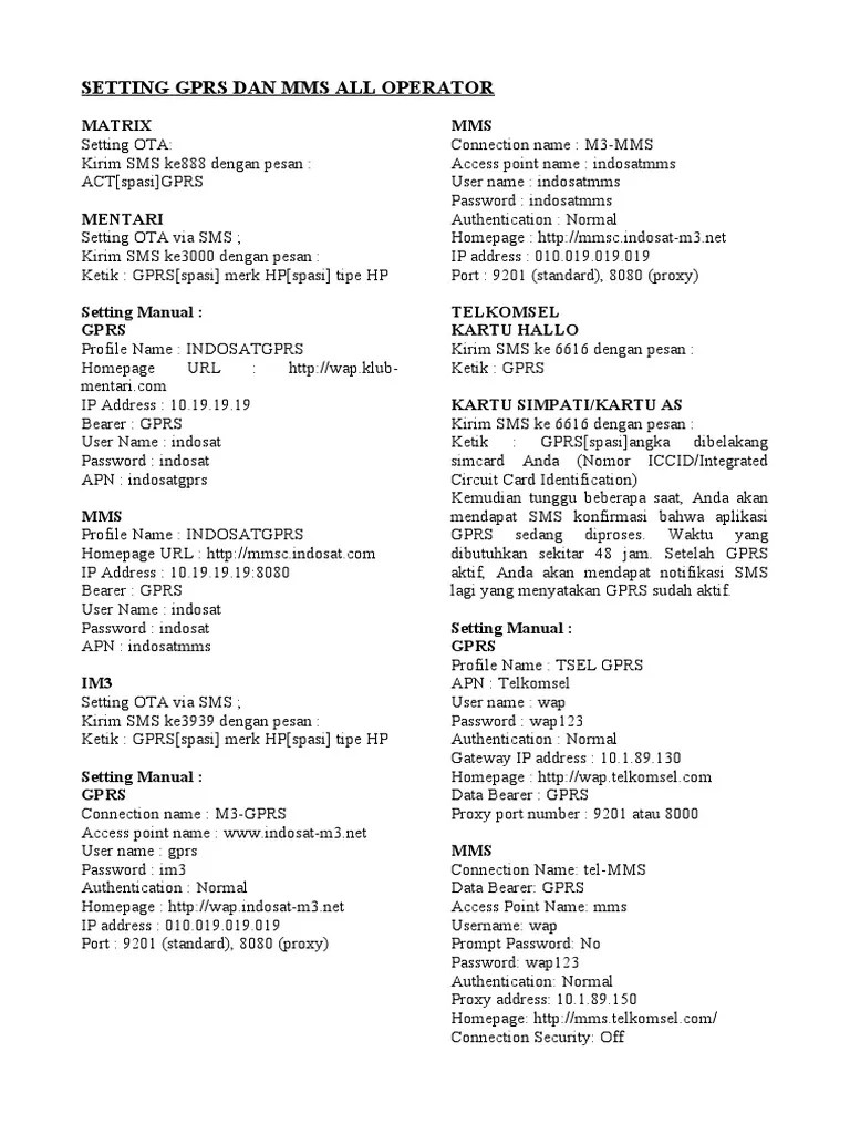 Setelah menu layanan di terima, pilih menu no 2. Sending you just need to set up a socket server that the modem can connect to. Menggunakan ponsel dengan fasilitas gprs. Setting gprs ota ketik sms: Setting gprs manual profile name :
